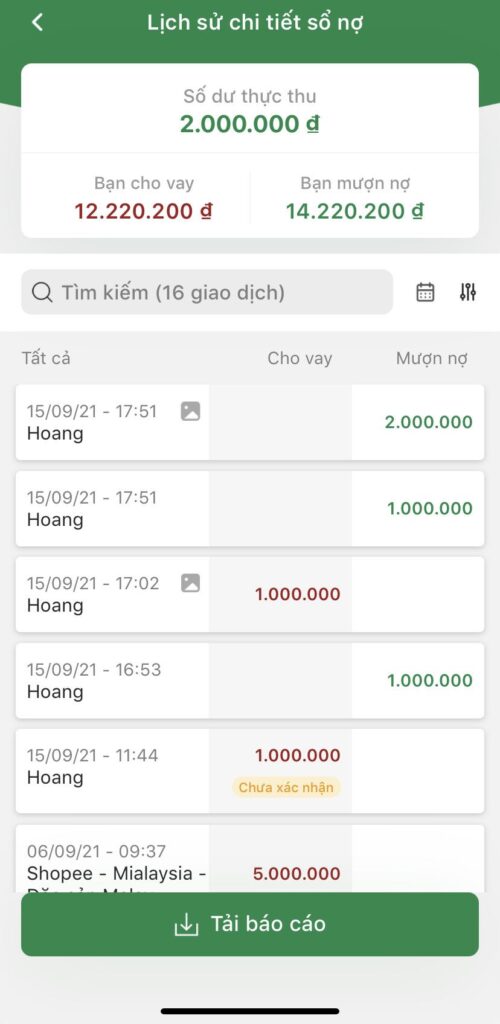 • Có thể lọc theo những khoản mượn nợ/cho vay/thanh toán