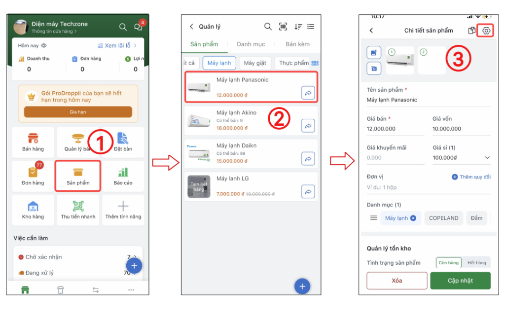 Cách 1: Tại trang Quản lý bạn chọnSản phẩm (1) > chọn sản phẩm cần bật đơn vị quy đổi (2) > chọn cài đặt (3) > Bật nút quy đổi đơn vị (4)