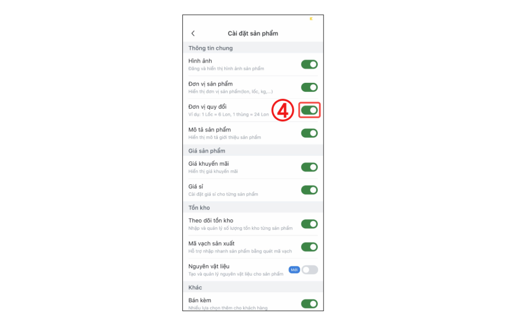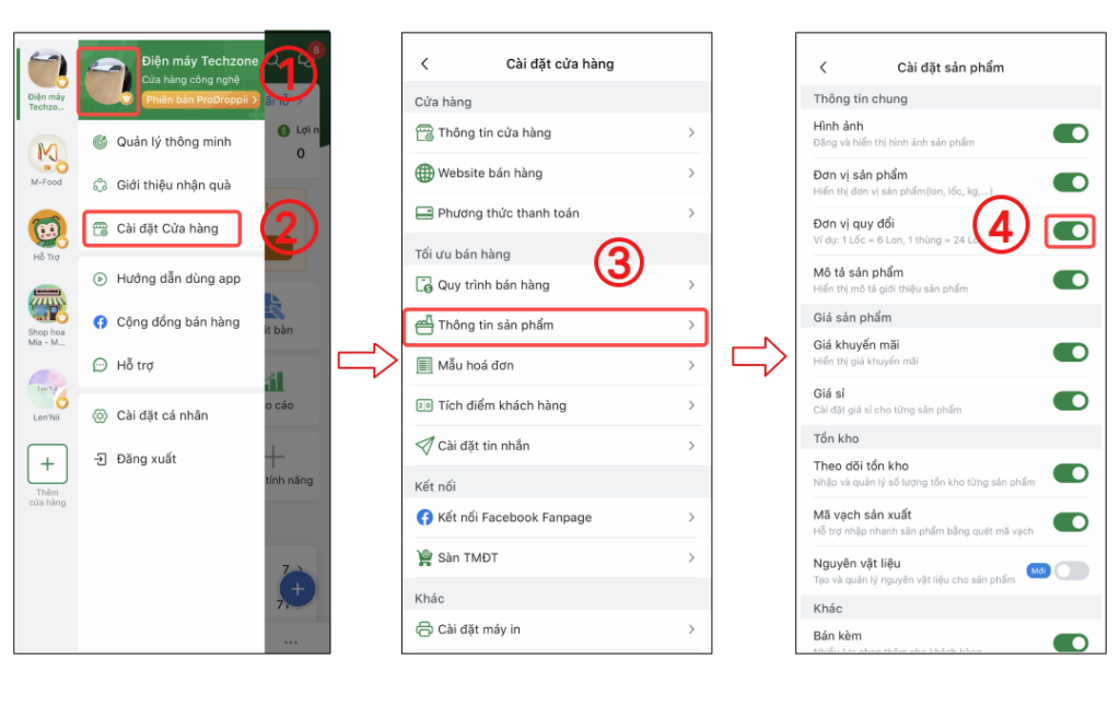 Cách 2: Bấm vào logo cửa hàng (1) > chọn mục cài đặt cửa hàng (2) > chọn mục thông tin sản phẩm (3) > bật nút đơn vị quy đổi (4)