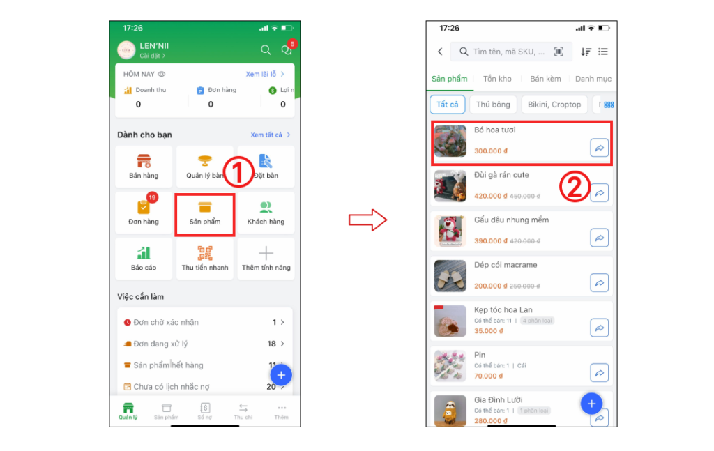 Bước 1: Tại trang chủ của ứng dụng, chọn Sản phẩm (2) > chọn Sản phẩm cần sửa giá (3)