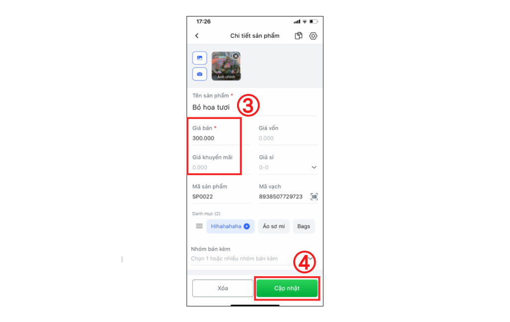 Bước 2: Tại màn hình Chi tiết sản phẩm, bạnchỉnh sửa giá sản phẩm tại Giá bán hoặc Giá khuyến mãi (3). Sau đó chọn Cập nhật (4) để lưu giá sản phẩm đã chỉnh sửa.