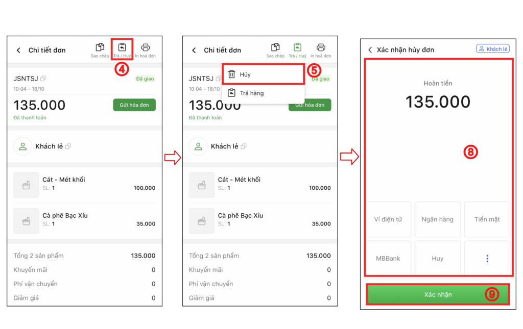 Tại đây, bạn bấm vào mục Trả/Hủy(4) > chọn Hủy(5) > chọn nguồn tiền hoàn(8) > bấm Xác nhận(9) để hủy đơn.