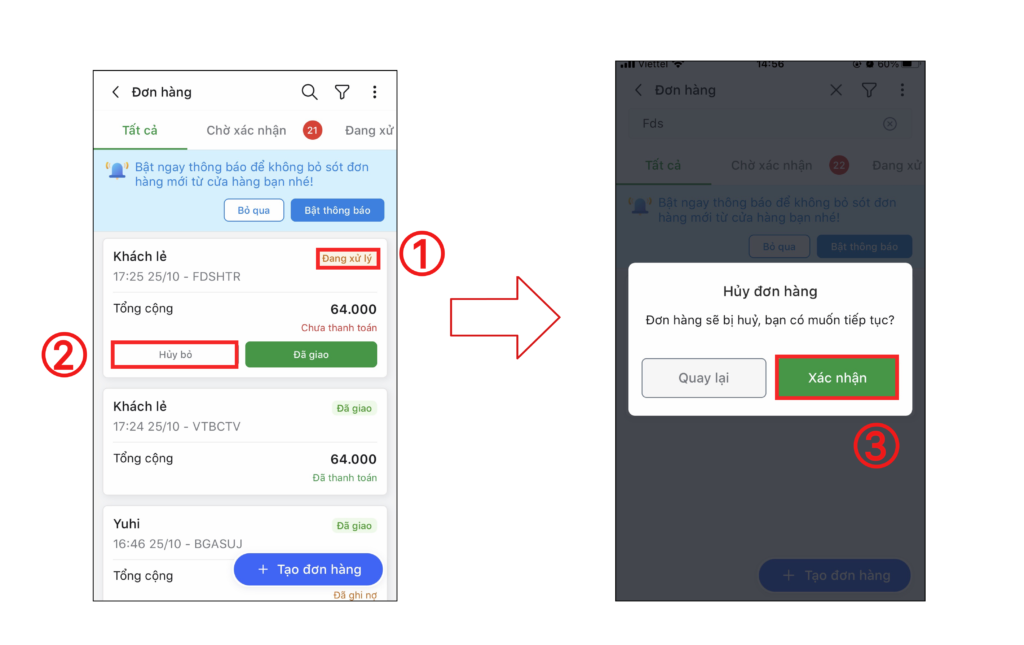 Đối với đơn hàng Đang xử lý(1) bạn chọnHủy Bỏ (2) > chọn Xác nhận (3) để xác nhận hủy đơn.