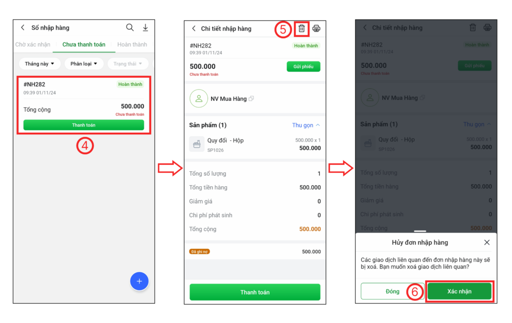 Bước 2: Chọn vào đơn nhập hàng chưa thanh toán cần hủy (4), chọn vào biểu tượng thùng rác (5) > sau đó, bấm Xác nhận (6) để hủy phiếu nhập hàng