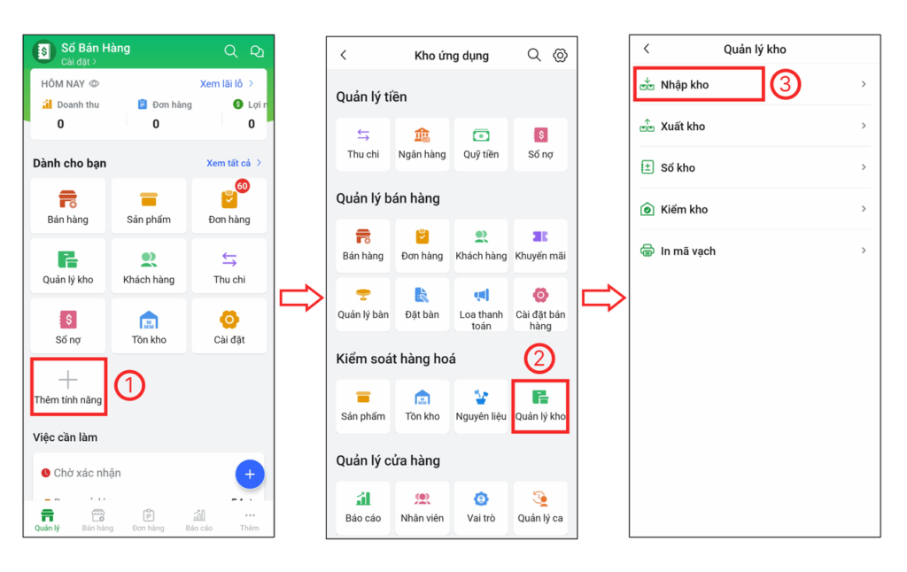 Bước 1: Tại màn hình Quản lý, bạn chọn Thêm tính năng (1) > chọnQuản lý kho (2) > chọnNhập kho (3).