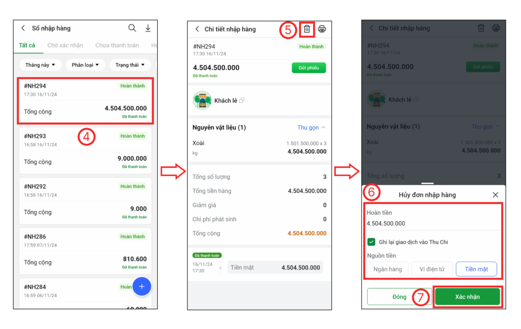 Bước 2: Chọn vào đơn nhập hàng đã thanh toán cần hủy (4), chọn vào biểu tượng thùng rác (5) để hủy