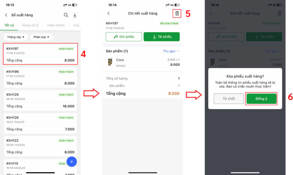 Bước 2: Chọn vào đơn nhập hàng đã thanh toán cần hủy (4) > chọn vào biểu tượng thùng rác (5) > chọnĐồng ý (7) để xác nhận hủy phiếu.