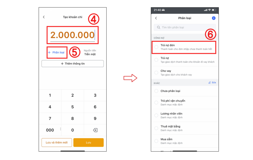 Bước 2: Nhập số tiền bạn đã chi để trả nợ đơn nhập hàng (4) > chọn Phân loại (5) > chọn Trả nợ đơn (6)