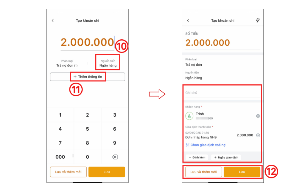 Bước 3: Chọn nguồn tiền (10) > chọn Thêm thông tin (11) để thêm các thêm các thông tin khác cho khoản chi này như: