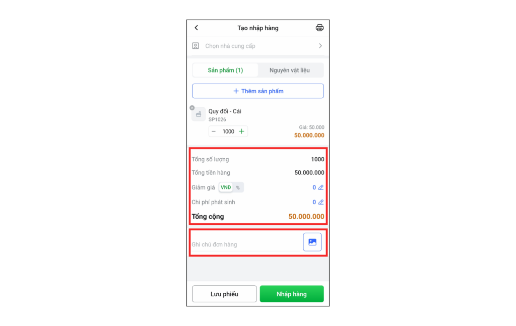 - Ghi chú đơn hàng: Bạn viết ghi chú ở đây và có thể lưu lại ảnh hàng hoá nhập kho hoặc ảnh chứng từ do nhà cung cấp gửi.