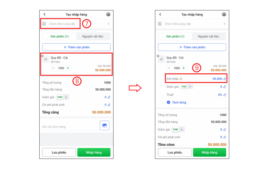 Nếu giá nhập thay đổi so với giá đã lưu, bạn có thể chỉnh sửa giá nhập ngay tại phiếu nhập hàng bằng cách nhấn vào sản phẩm cần sửa giá (8), tại Giá nhập bạn chọn vào biểu tượng cây viết (9) và nhập giá nhập mới.