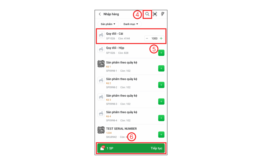Bước 2: Tại màn hình nhập hàng, bạn tìm theo tên hoặc mã sản phẩm cần nhập hàng (4) > Điền số lượng cần nhập (5) > Chọn Tiếp tục (6).