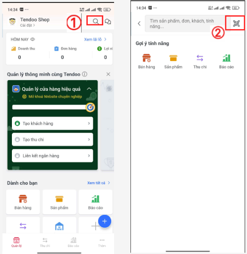 Bước 2: Mở ứng dụng Tendoo, tại màn hình chính, chọn biểu tượng tìm kiếm rồi chọn biểu tượng quét mã QR