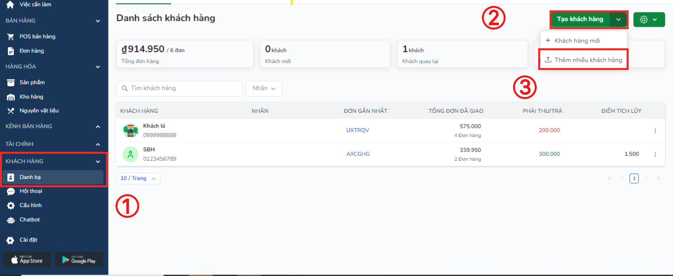 Bạn vào mục Khách hàng chọn Danh bạ (1) > Tạo khách hàng (2) > Thêm nhiều khách hàng (3)
