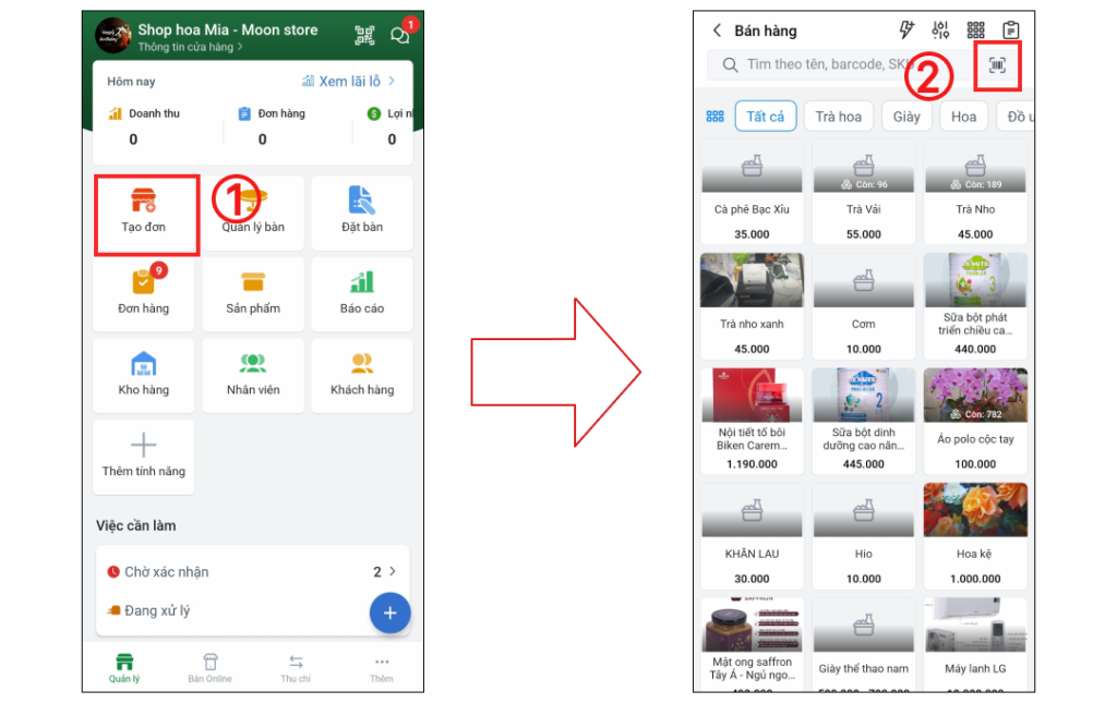 1. Quét mã vạch sản phẩm để lên đơn hàng tại Tạo đơn