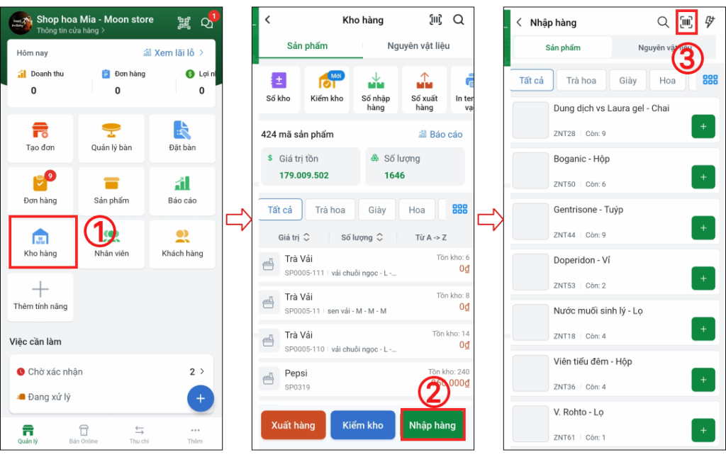 3. Quyét mã vạch sản phẩm để nhập kho tại Kho hàng