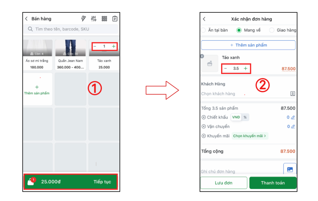 Tại mục tạo đơn hàng chọn sản phẩm (1) > điền trực tiếp số 3.5 vào ô (2) > Tiếp tục để hoàn thành đơn hàng