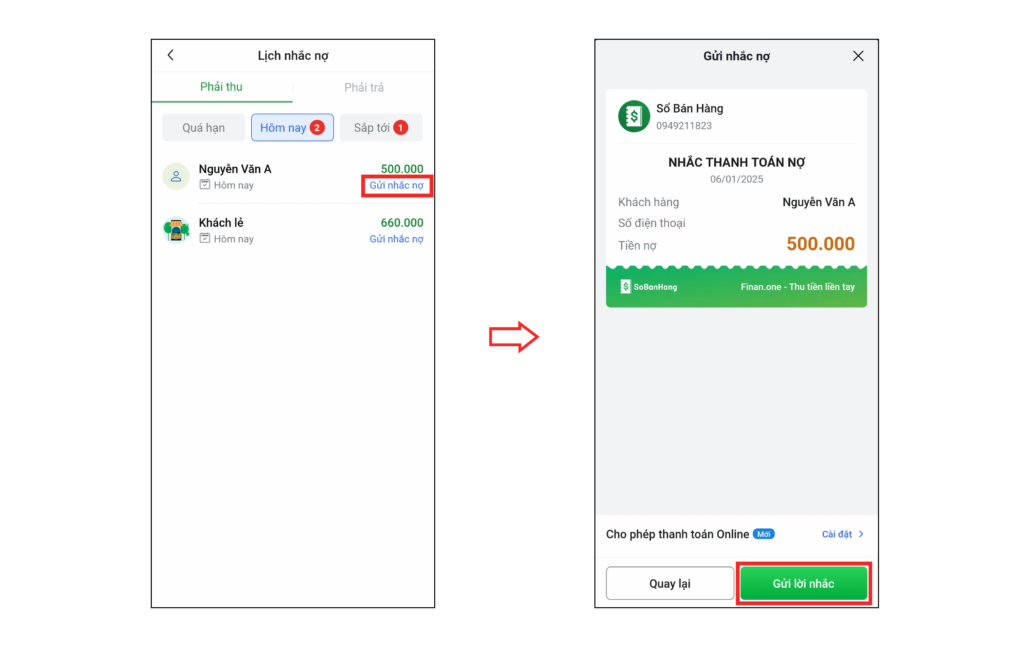Tại trang quản lý lịch nhắc nợ, bạn chọn vào Hôm nay hoặc Quá hạn để gửi nhắc nợ đến khách hàng.