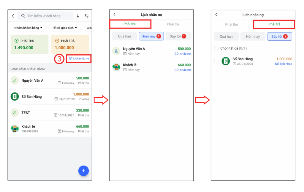 Bước 2: Tại màn hình Sổ nợ, bạn chọn vào Lịch nhắc nợ (3), tại đây bạn có thể xem được thời gian đến hạn thu hồi nợ hoặc thanh toán nợ.