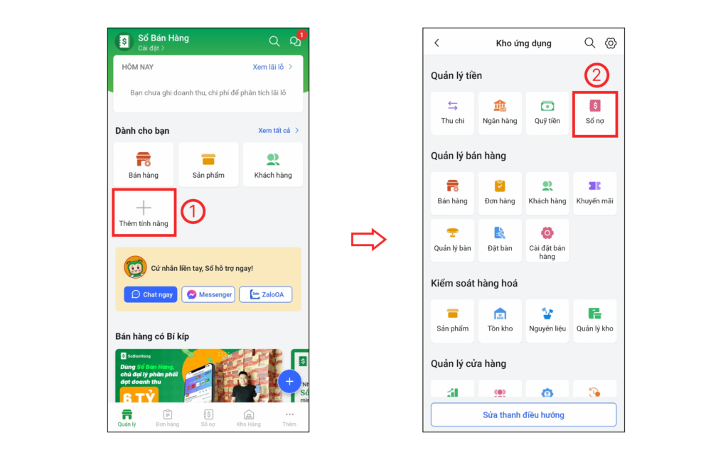- Cách 1: Chọn Thêm tính năng (1) để mở Kho ứng dụng của Sổ Bán Hàng > Chọn Sổ nợ (2)