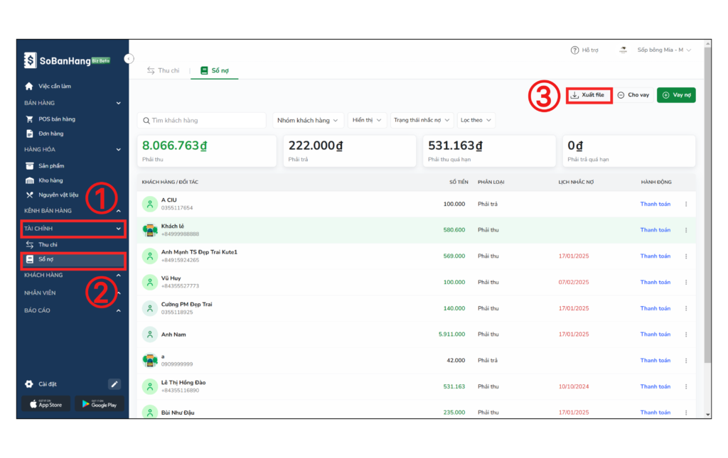 Bạn chọn mục Tài chính (1) > Chọn Sổ nợ (2) > Chọn Xuất file (3) để tiến hành tải file Excel sổ nợ về máy tính của bạn.